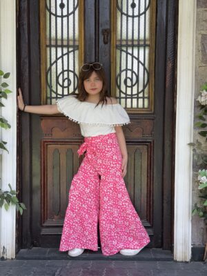 Off Shoulder Bell Sleeve Floral Top & Elastic Waist Belted Loose Textured Wide-Leg Pants Set