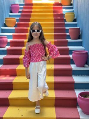 Off Shoulder Frill Trim Blouse & Printed Woven Pants Set With Headband