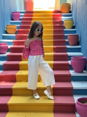 Puff Sleeves Off Shoulder Blouse & Color Block Wide-Leg Pants