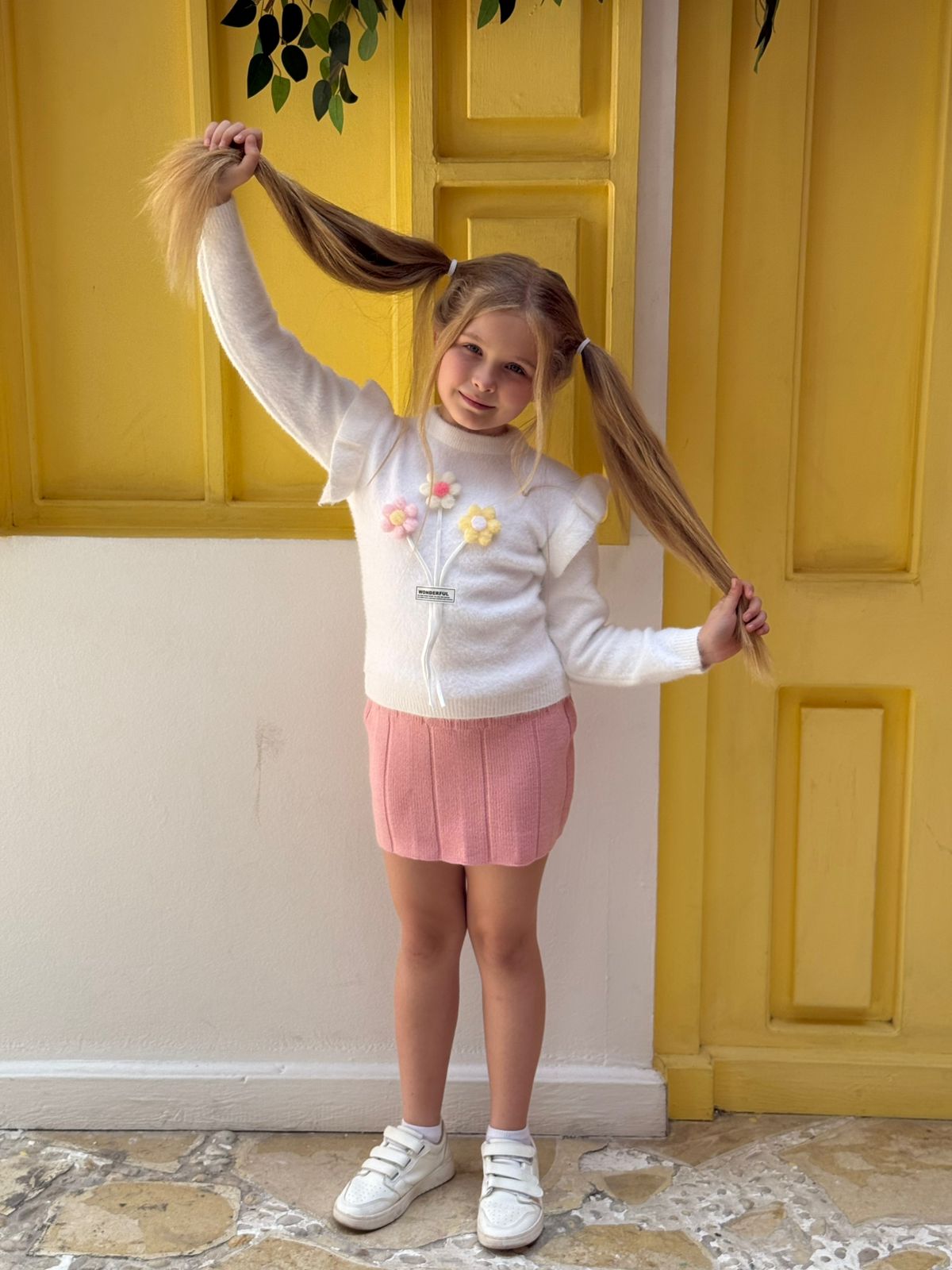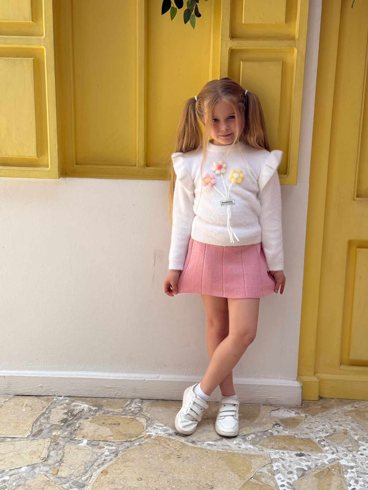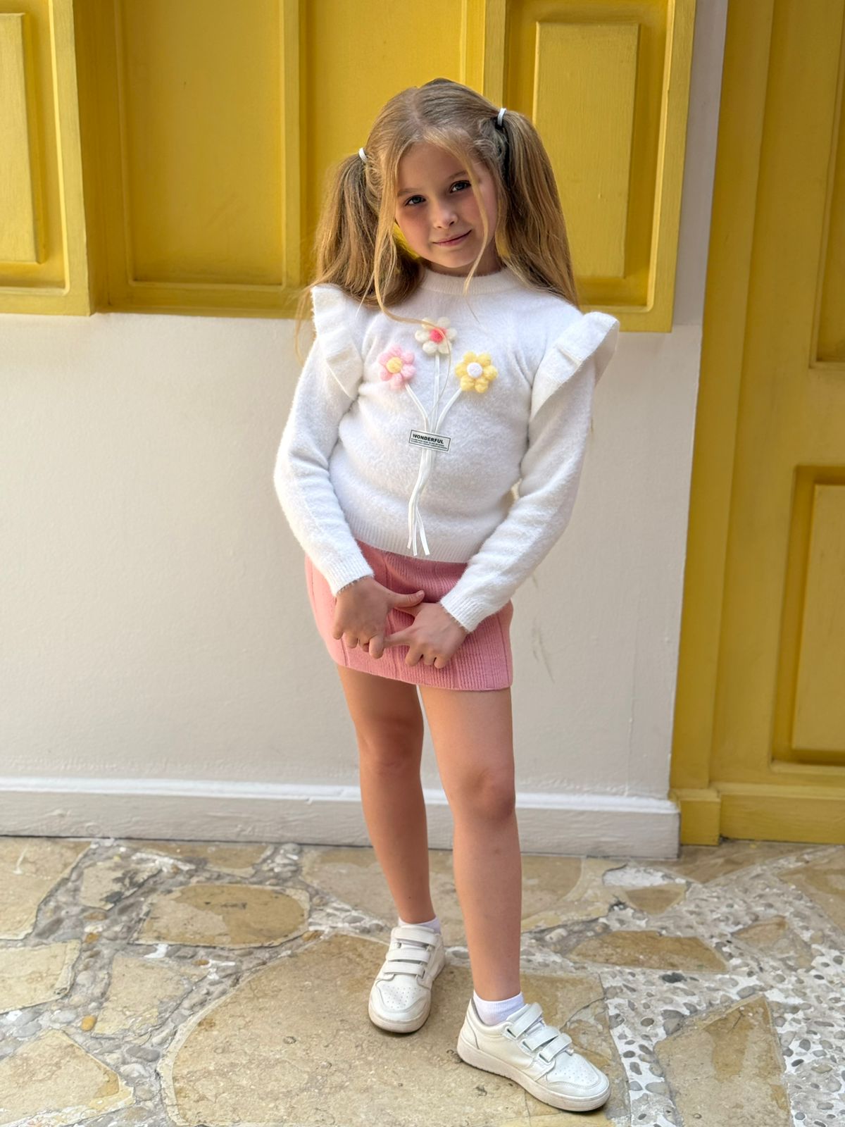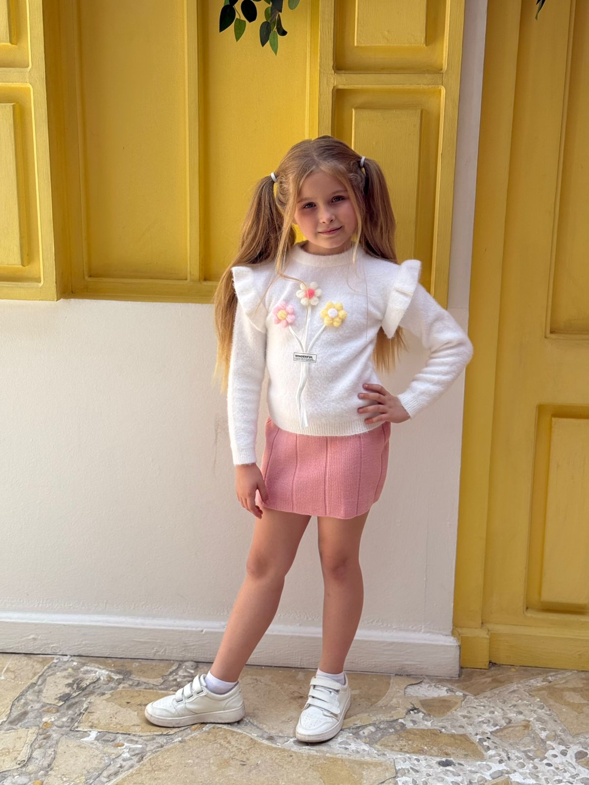 3D Floral Applique Ruffle Trim Knitted Sweater & Ribbed Pink Skirt Set