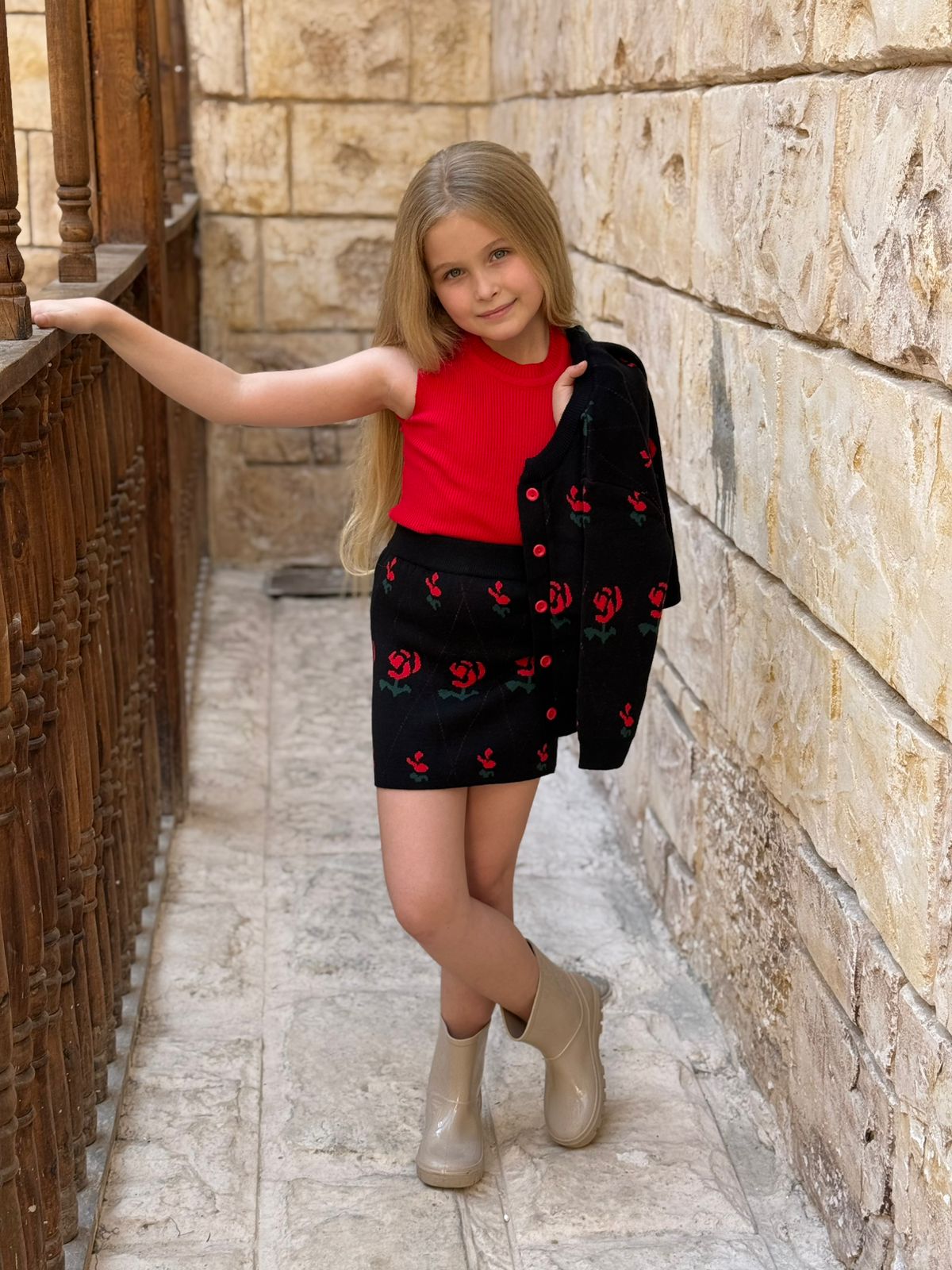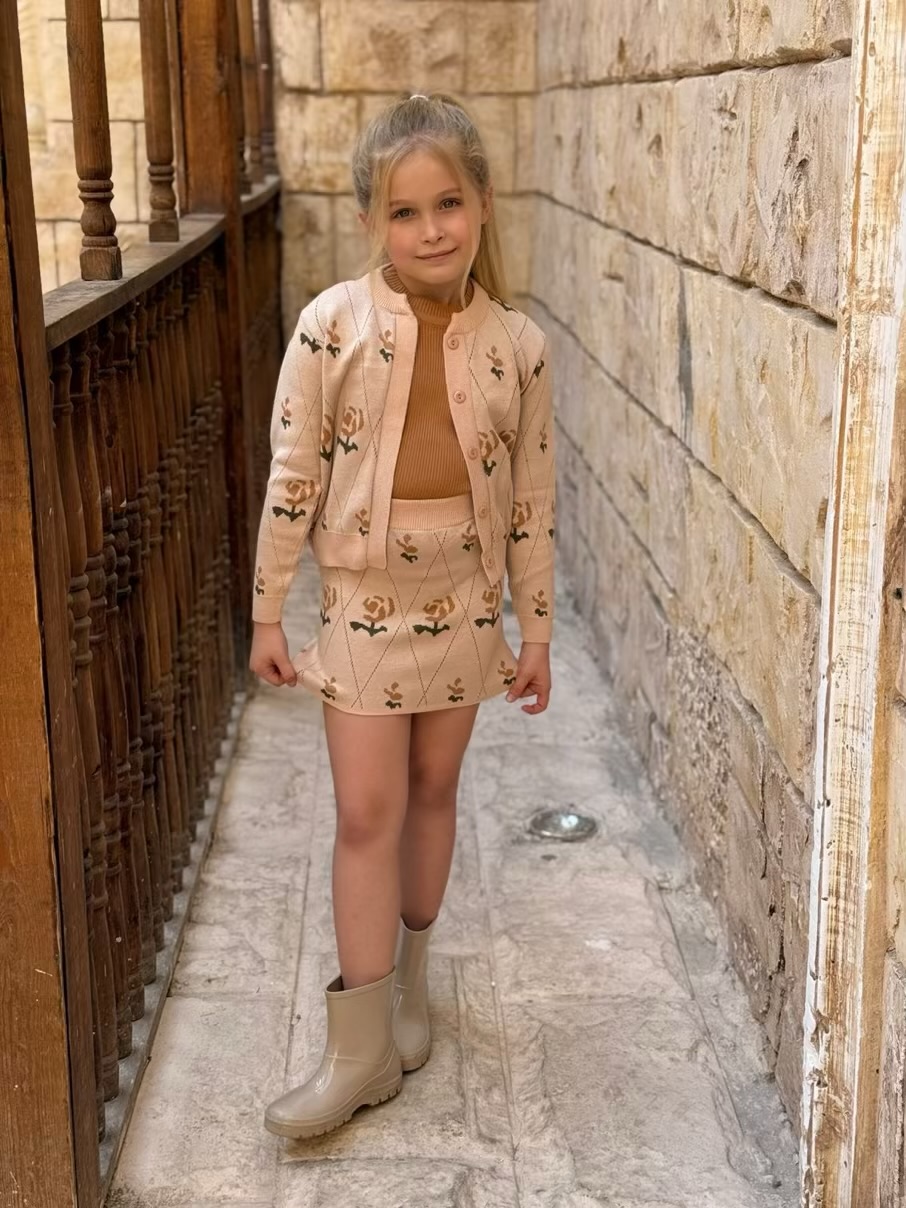 3PCS Set Solid Basic Top & Floral Knitted Jacket & Skirt