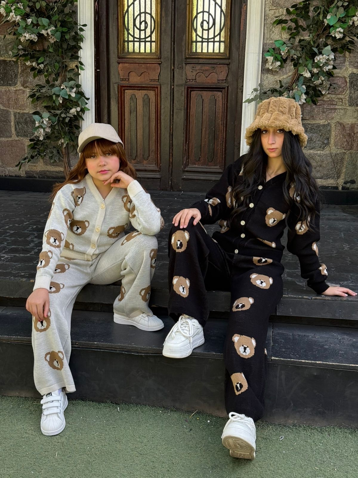 Bear Print Knit Jacket & Wide Leg Pants Set