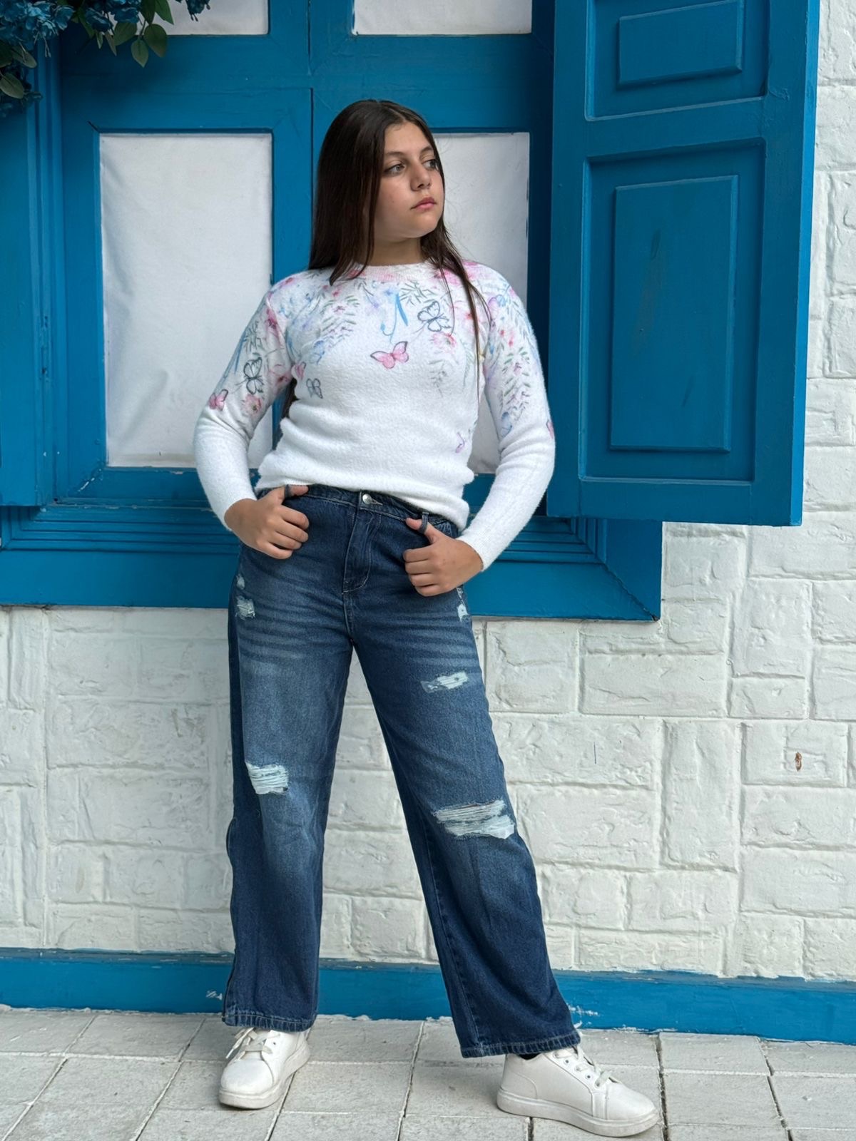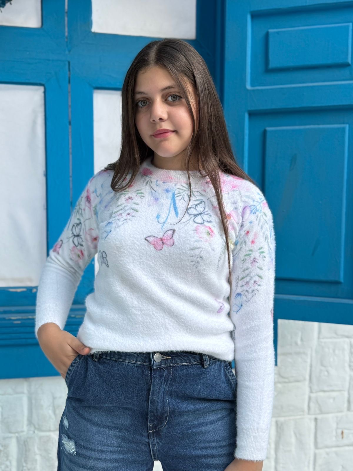 Butterfly & Floral Print Fuzzy Knit Sweater
