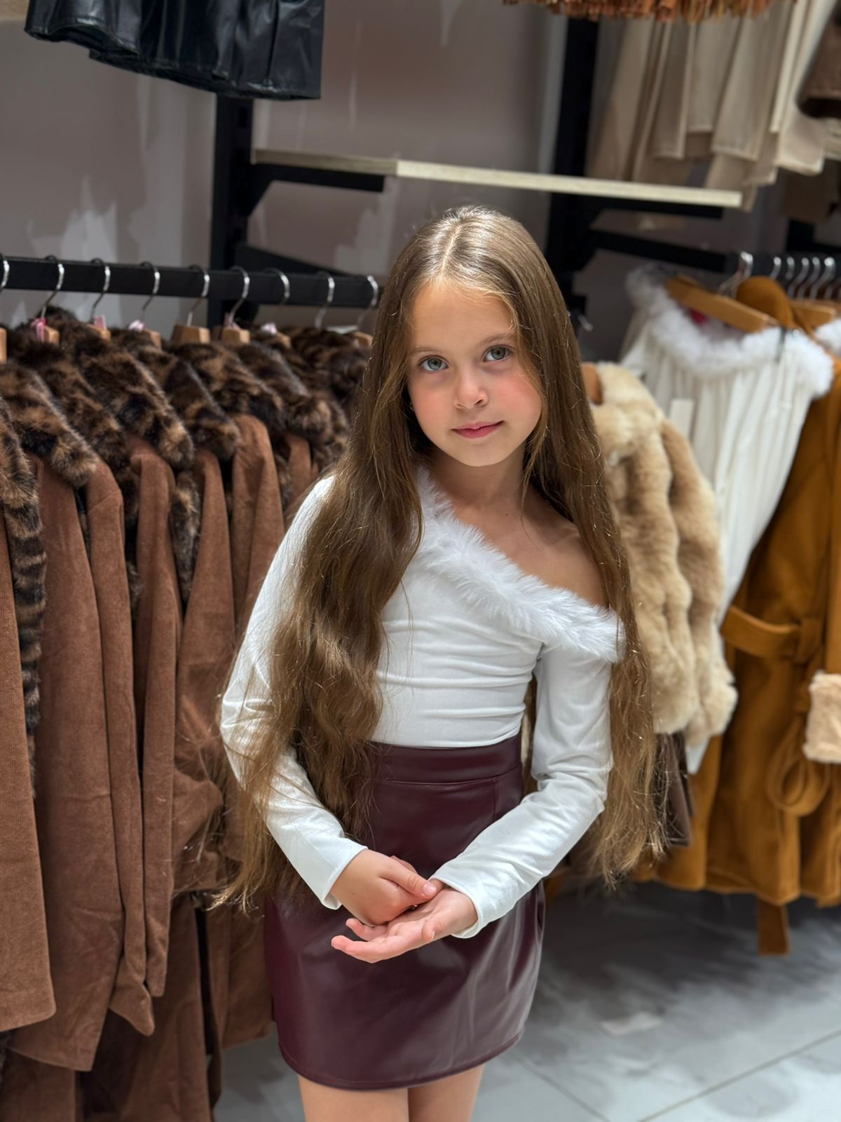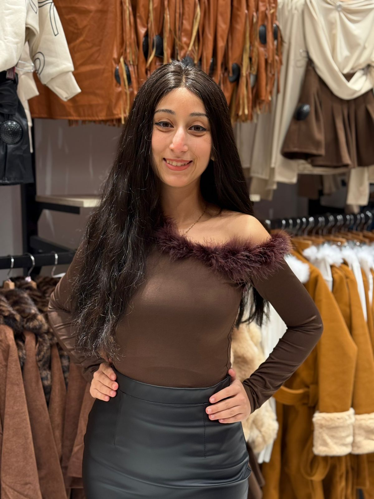 Faux Fur Trim One Shoulder Long Sleeve Top