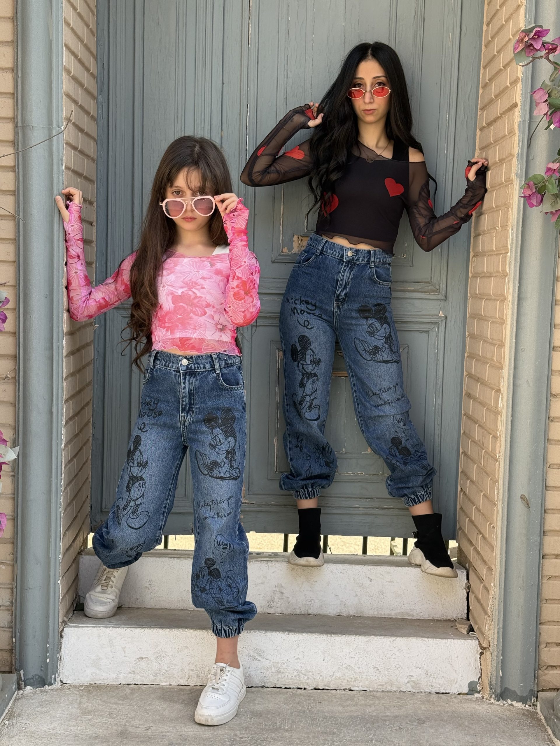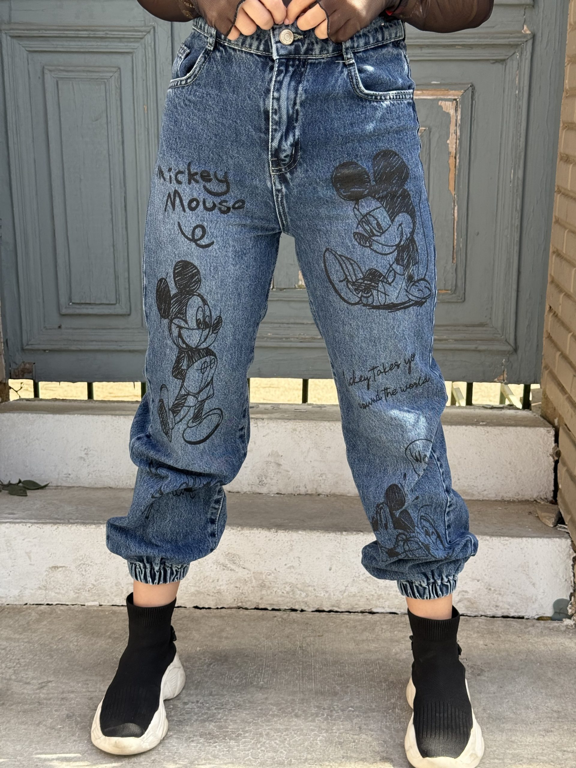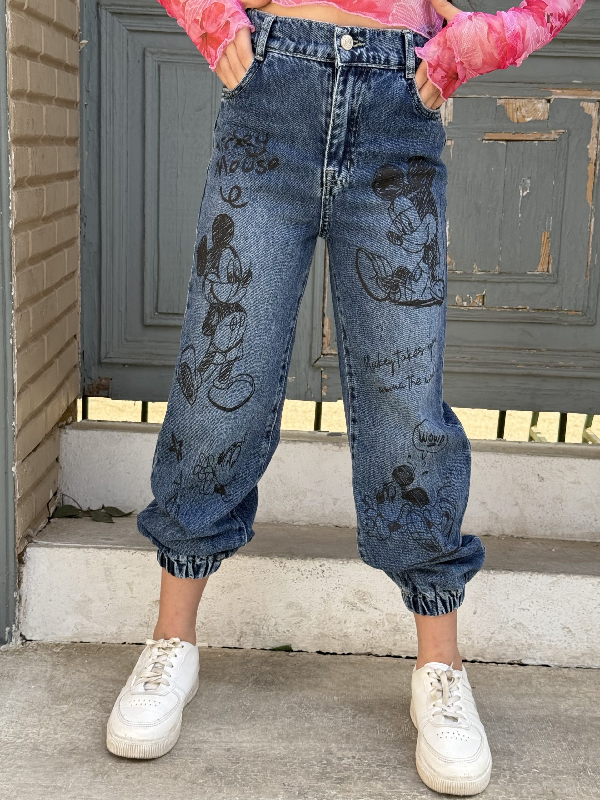 Mickey Print High Waist Cargo Denim Jeans