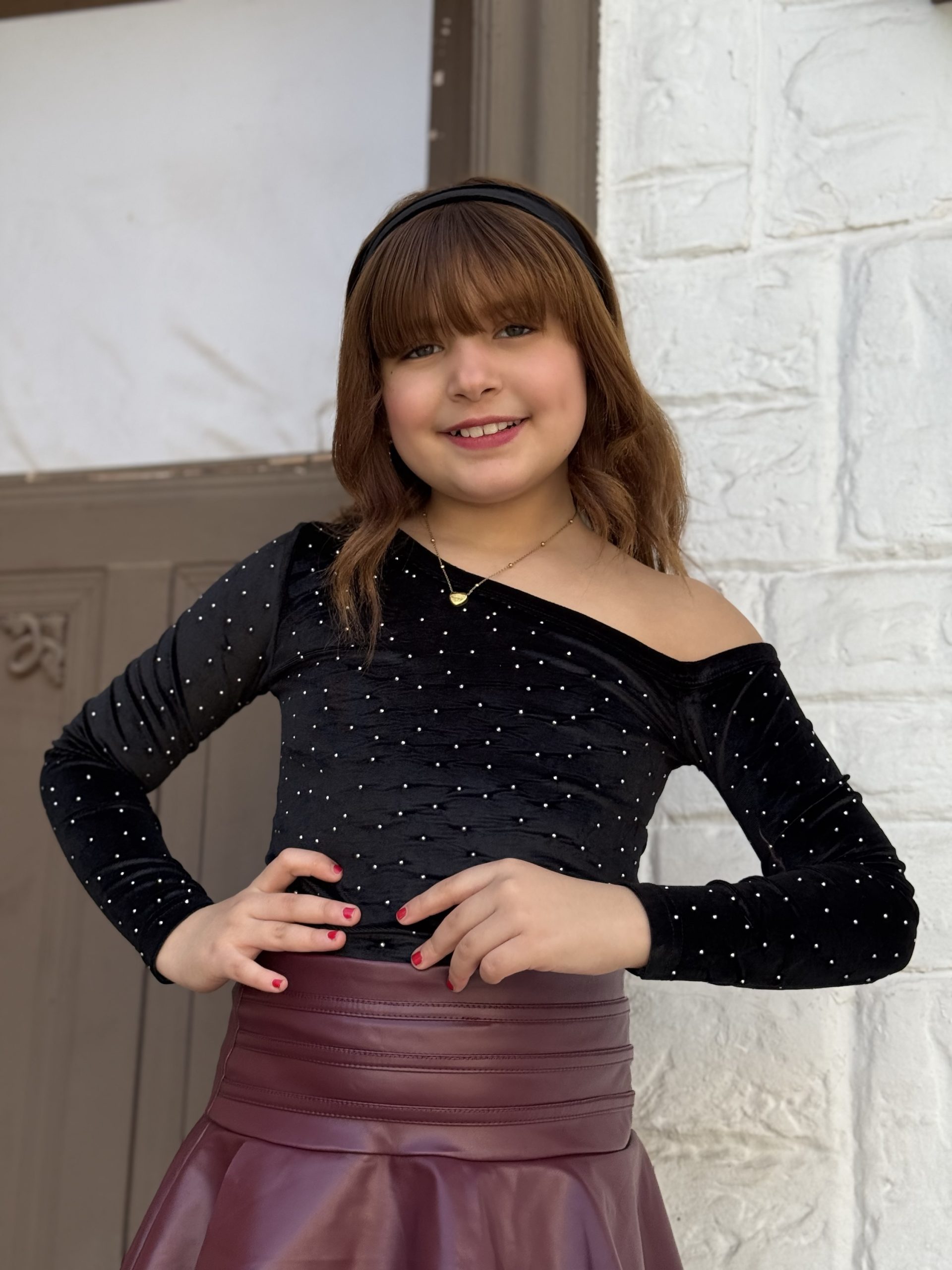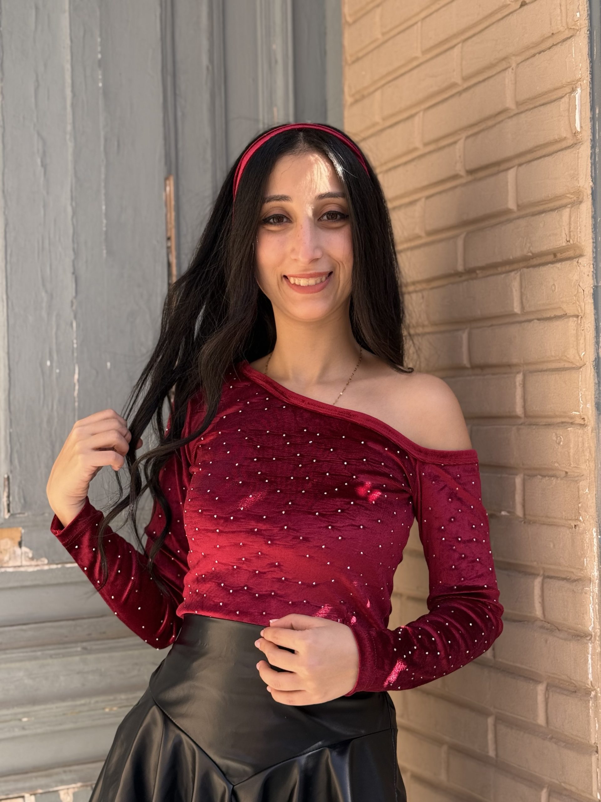 Off-Shoulder Rhinestone Decor Velvet Slim Fit Top With Headband