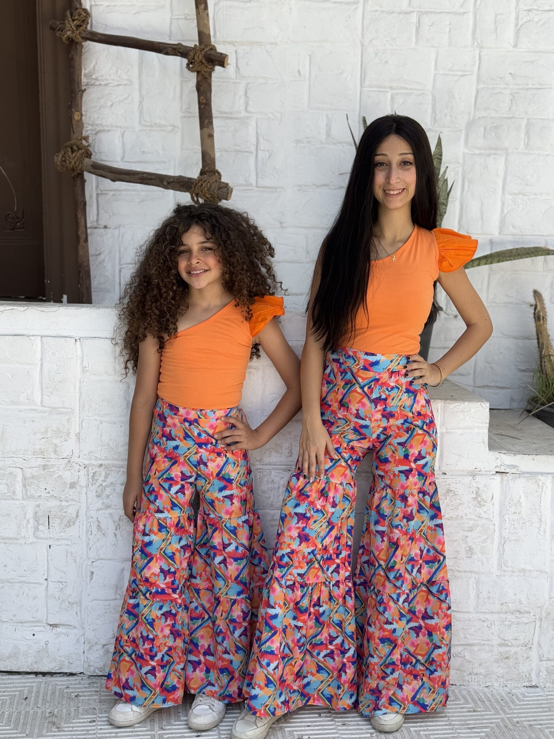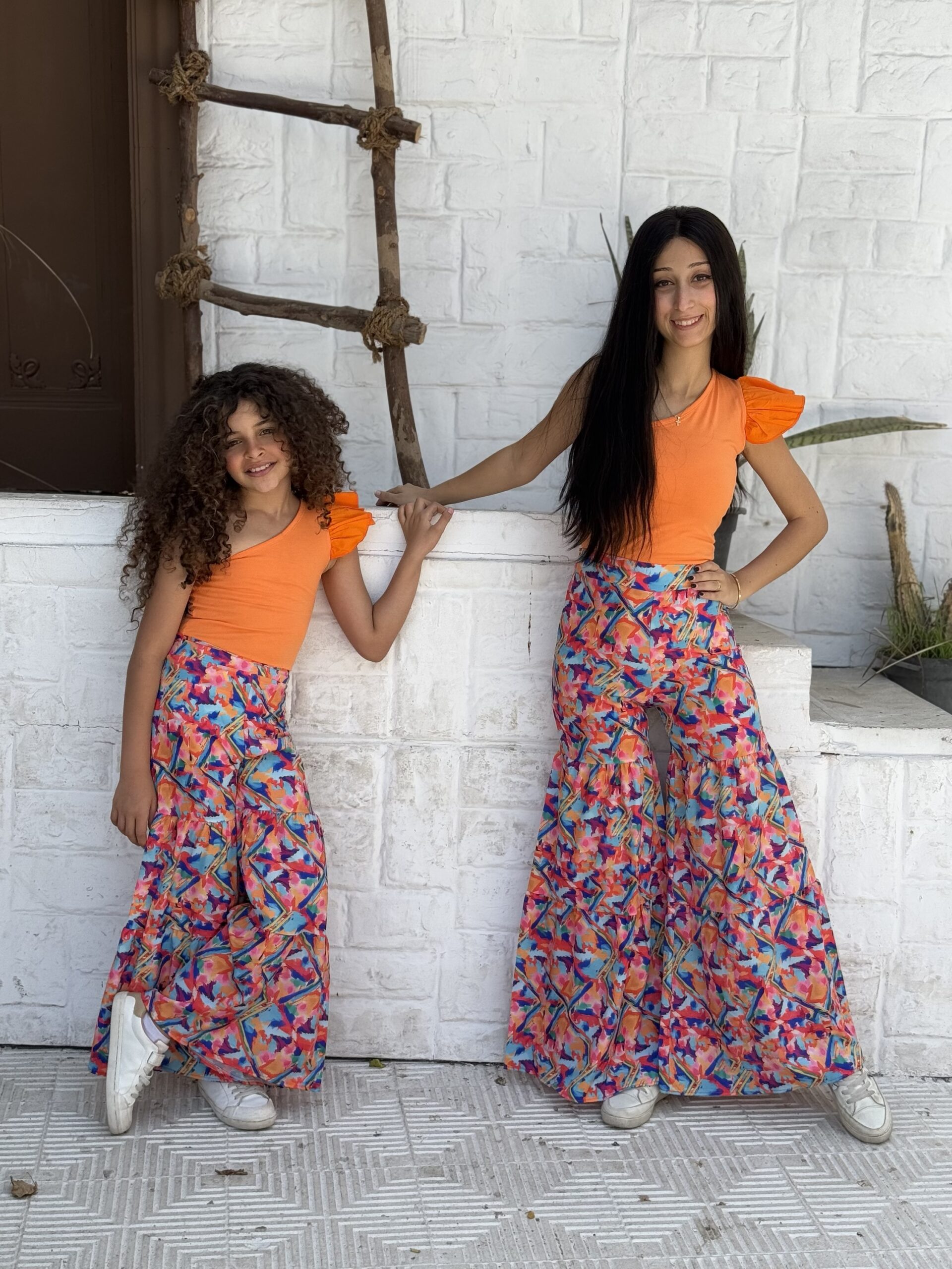 One Shoulder Plain Top & Full-Length Abstract Geometric Print Pattern Resort Wide Leg Pants