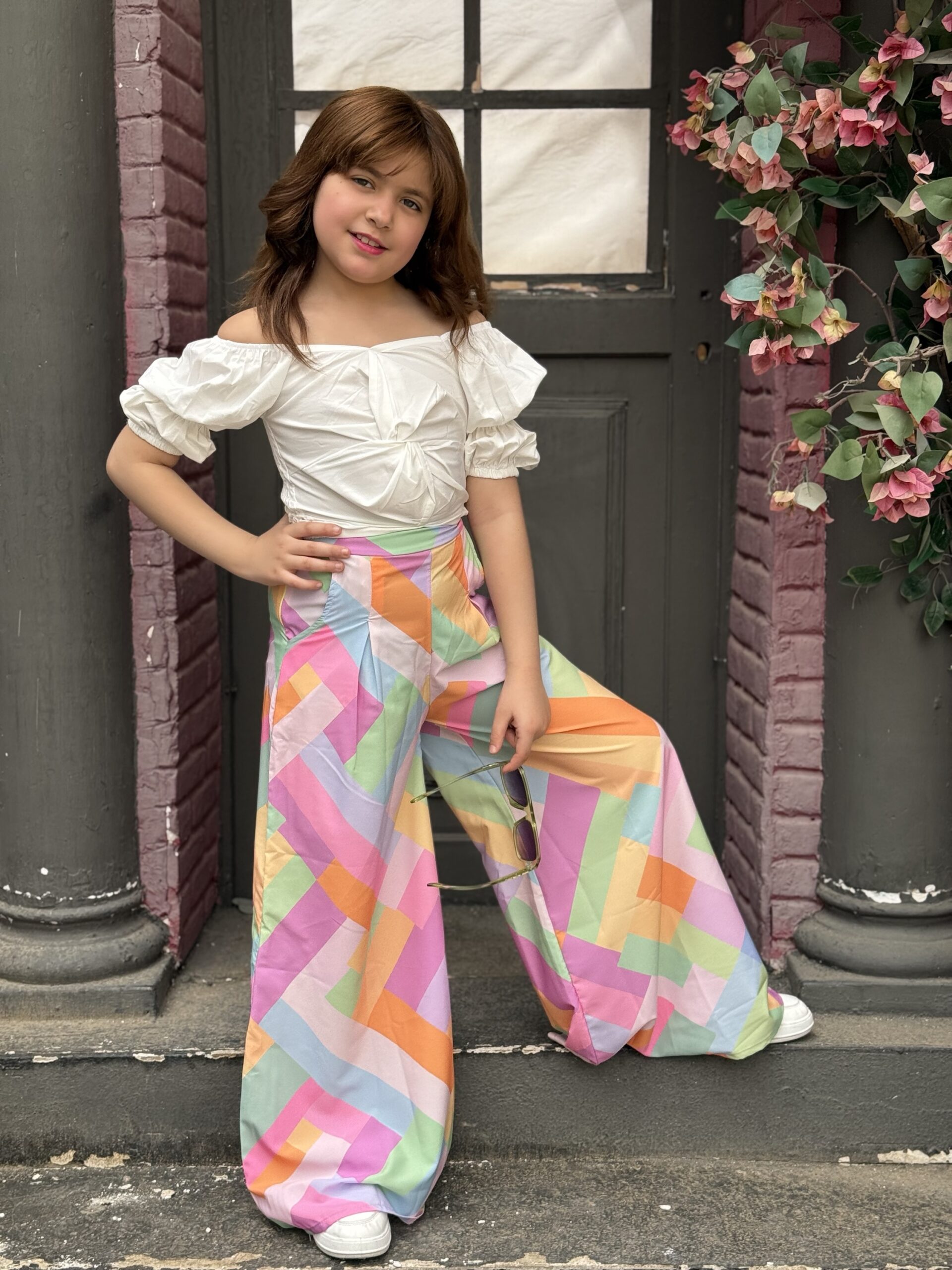 Puff Sleeves Off Shoulder Blouse & Color Block Wide-Leg Pants