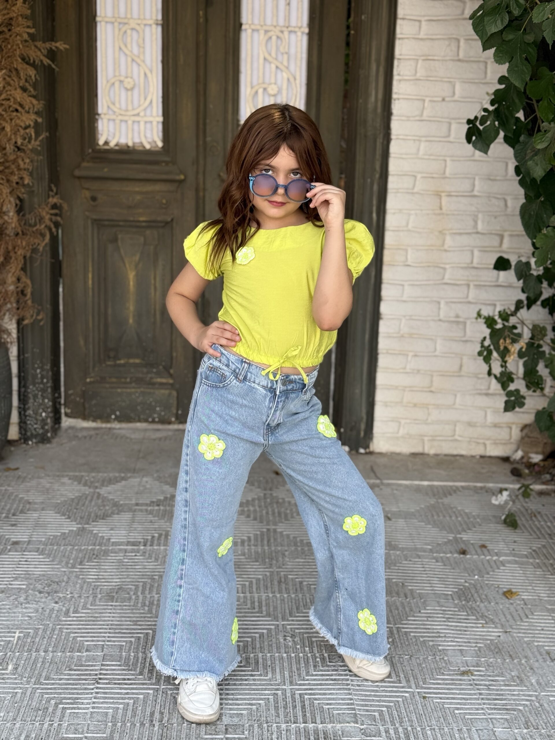 Short Sleeve Crew Neck T-Shirt & 3D Flowers Wide Leg Jeans Pants